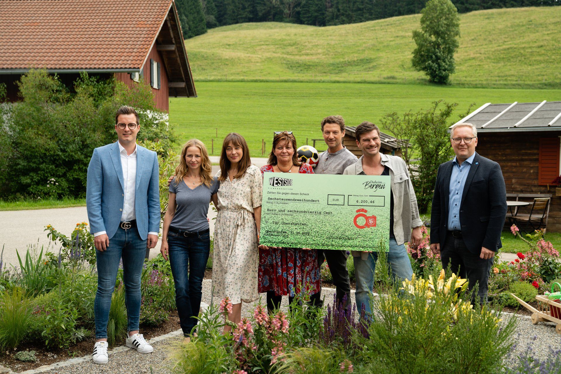 Für den TSV Oberstaufen bedeutet die Spende der Produktionsfirma eine wesentliche Unterstützung beim Bau des neuen Kunstrasenplatzes in Kalzhofen. „Wir freuen uns wirklich sehr über diese besondere Spende“, sagte Abteilungsleiterin Susanne Reichart. „Es ist ein außergewöhnlicher Beitrag, der unser Projekt extrem voranbringt.“ Das Foto zeigt Verantwortliche und Schauspieler bei der Übergabe des Schecks (von links): Moritz Emerich (Allianz Emerich, zuständig für den Parzellenverkauf), Theresa Scholze (in der Filmrolle als Lisa Huber), Catherine Bode (als Marie Huber), Susanne Reichart (Fußball-Abteilungsleiterin TSV Oberstaufen), Thomas Unger (als Georg Leitner), Matthi Faust (als Florian Leitner) und Oberstaufens Bürgermeister Martin Beckel. (Fotograf: Arvid Uhlig)